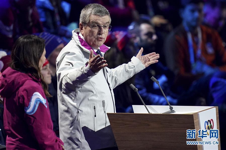 1月9日,国际奥委会主席巴赫(右)在开幕式上致辞。 当日,第三届冬季青年奥林匹克运动会开幕式在瑞士洛桑沃州体育馆举行。 新华社记者张晨霖摄