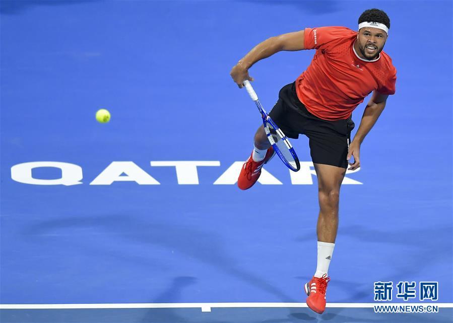 1月8日,特松加在比赛中发球。 当日,在卡塔尔首都多哈进行的2020年ATP卡塔尔网球公开赛单打第二轮比赛中,法国选手特松加以0比2不敌塞尔维亚选手凯茨曼诺维奇,无缘八强。 新华社发(尼库摄)