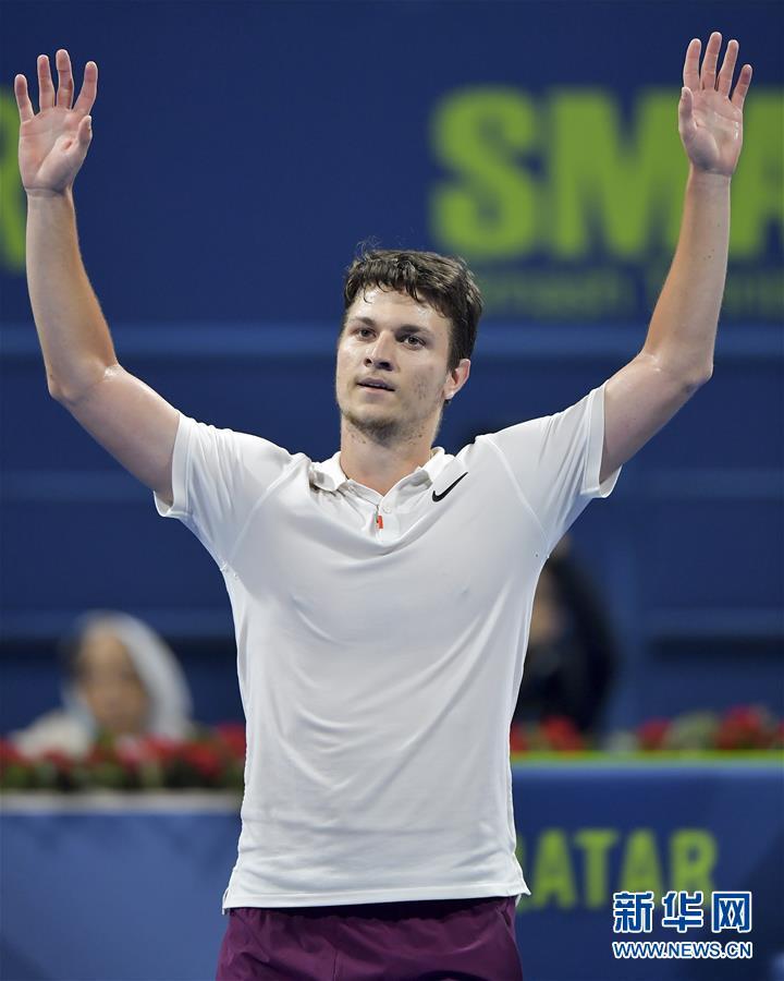 1月8日,凯茨曼诺维奇庆祝获胜。 当日,在卡塔尔首都多哈进行的2020年ATP卡塔尔网球公开赛单打第二轮比赛中,法国选手特松加以0比2不敌塞尔维亚选手凯茨曼诺维奇,无缘八强。 新华社发(尼库摄)