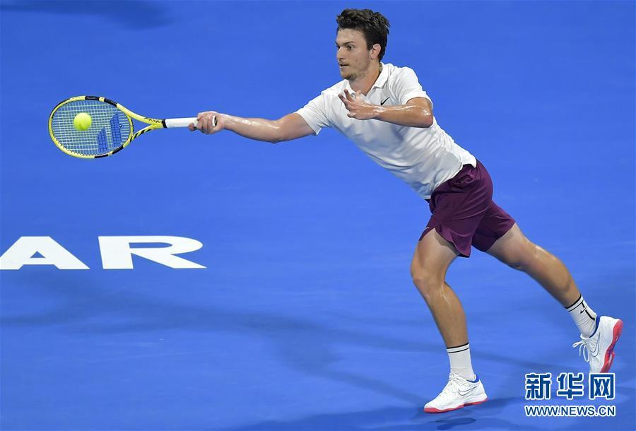 1月8日,凯茨曼诺维奇在比赛中回球。 当日,在卡塔尔首都多哈进行的2020年ATP卡塔尔网球公开赛单打第二轮比赛中,法国选手特松加以0比2不敌塞尔维亚选手凯茨曼诺维奇,无缘八强。 新华社发(尼库摄)