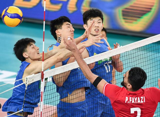 于垚辰、张哲嘉、刘力宾(从左至右)拦网防守伊朗队球员的扣球。