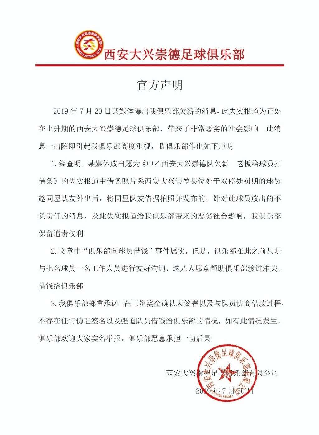 由于没有实体产业作为支撑,西安大兴崇德来到职业联赛后,资金十分紧张。据《足球报》报道,在赛季初球队便曾差点交不起上百万的保证金,幸好有某影视大佬帮助,球队才得以安心地征战中乙。而在年中时,为了通过足协对银行流水的审查,俱乐部在与球员友好协商后,决定让球员借款给俱乐部,然后俱乐部再打钱给球员。这样一来,俱乐部就暂时渡过了难关。