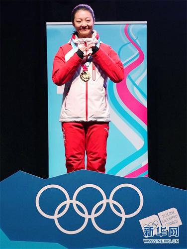 1月16日,中国选手杨滨瑜在圣莫里茨奖牌广场举行的颁奖仪式上。 当日,在瑞士圣莫里茨湖上进行的第三届冬季青年奥林匹克运动会速度滑冰女子集体出发项目比赛中,中国选手杨滨瑜以积分30分的成绩夺得金牌。 新华社记者张晨霖摄