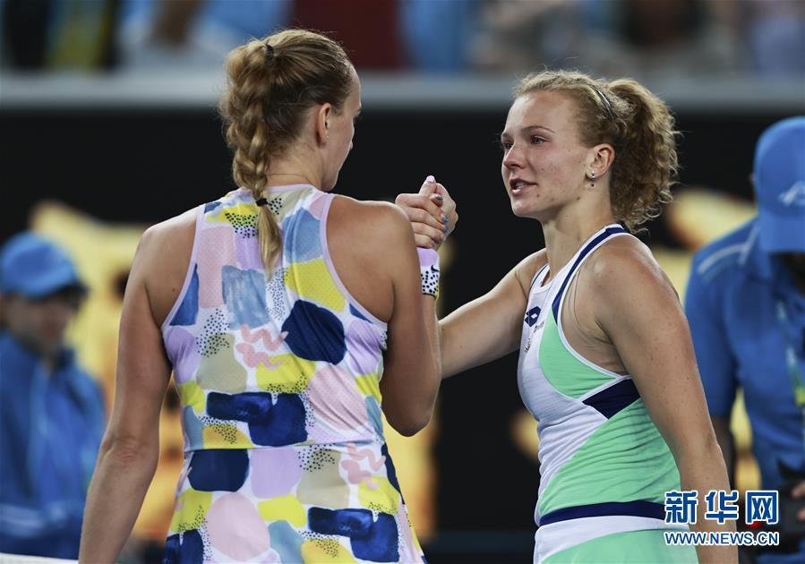 1月20日,西尼亚科娃(右)在比赛后向科维托娃表示祝贺。 当日,在澳大利亚墨尔本进行的澳大利亚网球公开赛女子单打首轮比赛中,捷克选手科维托娃以2比0战胜同胞西尼亚科娃,晋级下一轮。 新华社记者 王婧嫱 摄