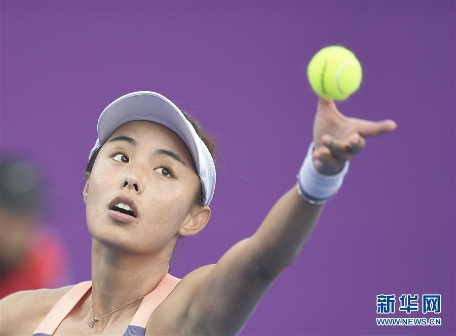 2月23日,中国选手王蔷在比赛中发球。 当日,在卡塔尔首都多哈进行的2020年WTA卡塔尔公开赛单打首轮比赛中,中国选手王蔷以0比2不敌比利时选手梅尔滕斯,无缘下一轮。 新华社发(尼库摄)