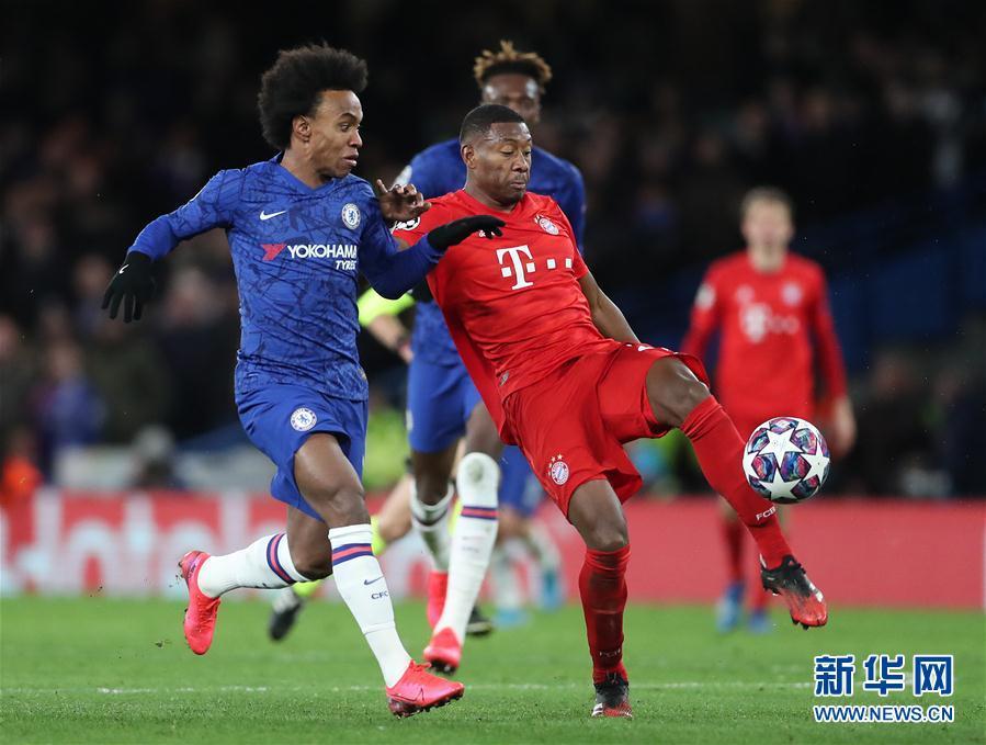 2月25日,拜仁慕尼黑队球员阿拉巴(前右)在比赛中与切尔西队球员威廉(左)拼抢。 当日,在2019-2020赛季欧洲足球冠军联赛八分之一决赛首回合比赛中,德甲拜仁慕尼黑队客场以3比0战胜英超切尔西队。 新华社发(马修·英佩摄)