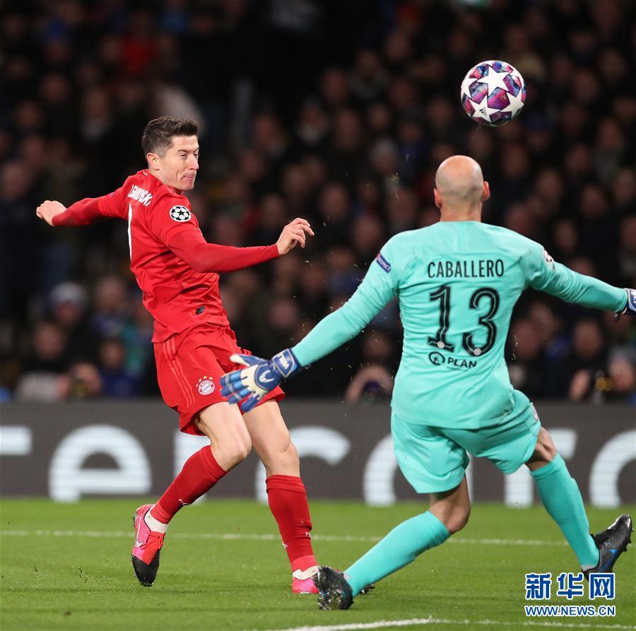 2月25日,拜仁慕尼黑队球员莱万多夫斯基(左)的射门被切尔西队门将卡巴列罗阻截。 当日,在2019-2020赛季欧洲足球冠军联赛八分之一决赛首回合比赛中,德甲拜仁慕尼黑队客场以3比0战胜英超切尔西队。 新华社发(马修·英佩摄)