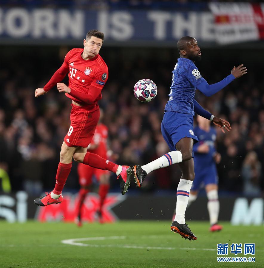 2月25日,拜仁慕尼黑队球员莱万多夫斯基(左)在比赛中与切尔西队球员吕迪格拼抢。 当日,在2019-2020赛季欧洲足球冠军联赛八分之一决赛首回合比赛中,德甲拜仁慕尼黑队客场以3比0战胜英超切尔西队。 新华社发(马修·英佩摄)