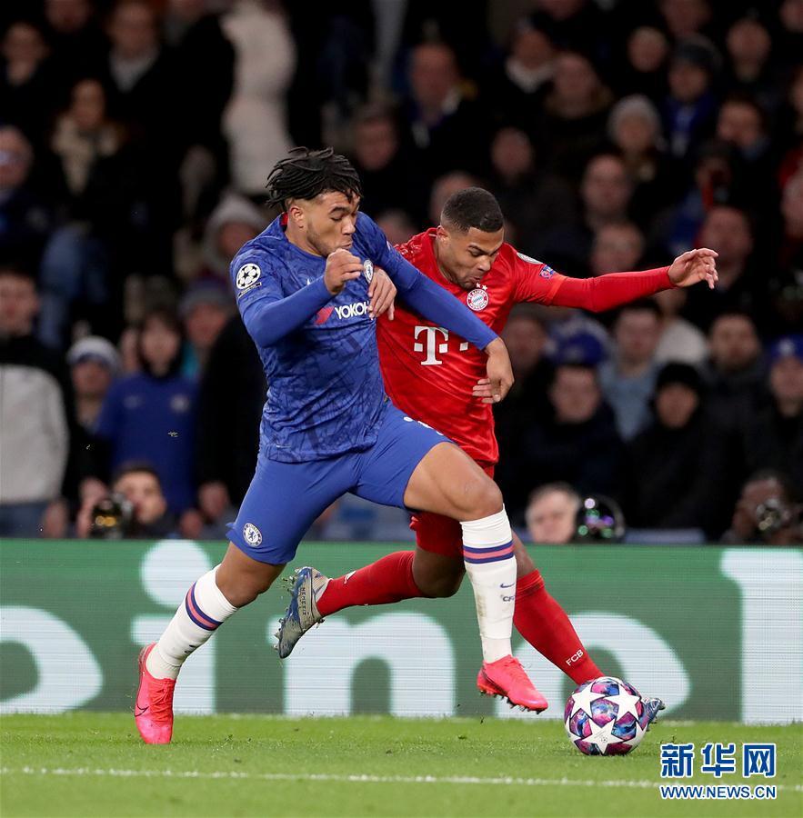 2月25日,切尔西队球员詹姆斯(左)在比赛中与拜仁慕尼黑队球员格纳布里拼抢。 当日,在2019-2020赛季欧洲足球冠军联赛八分之一决赛首回合比赛中,德甲拜仁慕尼黑队客场以3比0战胜英超切尔西队。 新华社发(马修·英佩摄)