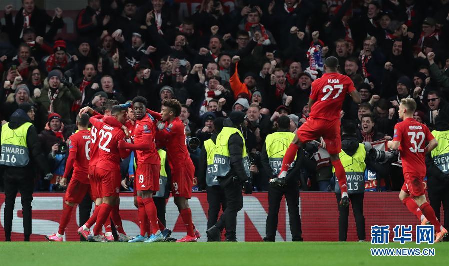 2月25日,拜仁慕尼黑队球员庆祝进球。 当日,在2019-2020赛季欧洲足球冠军联赛八分之一决赛首回合比赛中,德甲拜仁慕尼黑队客场以3比0战胜英超切尔西队。 新华社发(马修·英佩摄)