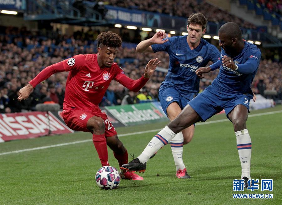 2月25日,拜仁慕尼黑队球员科曼(左)在比赛中与切尔西队球员吕迪格(右)拼抢。 当日,在2019-2020赛季欧洲足球冠军联赛八分之一决赛首回合比赛中,德甲拜仁慕尼黑队客场以3比0战胜英超切尔西队。 新华社发(马修·英佩摄)