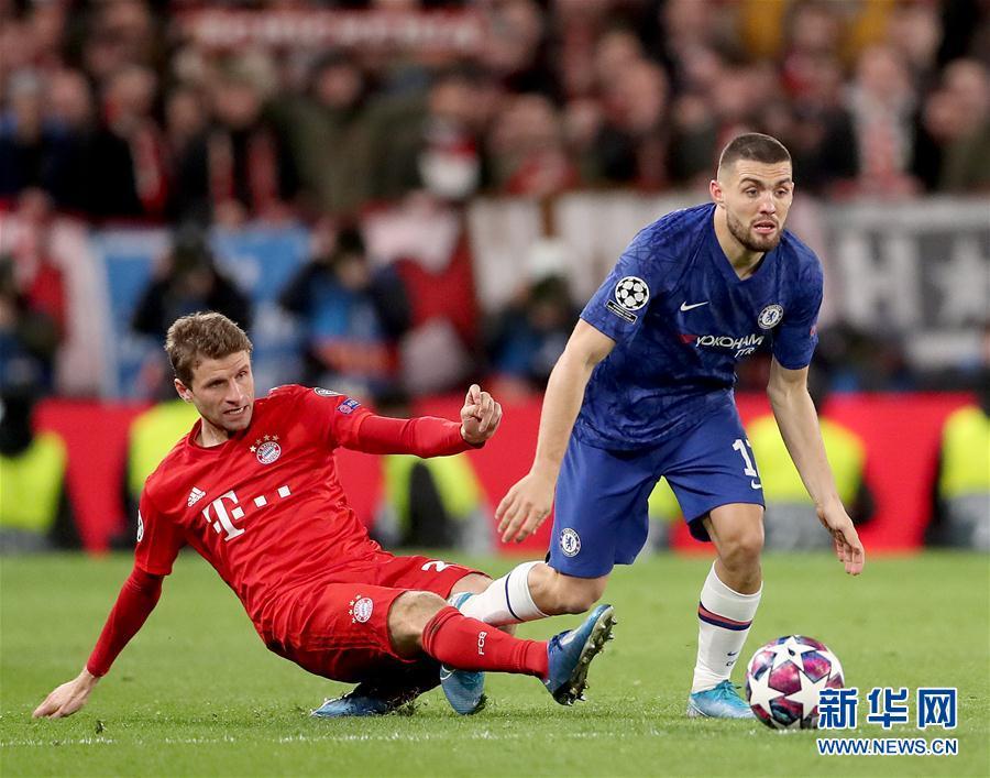 2月25日,切尔西队球员科瓦契奇(右)在比赛中与拜仁慕尼黑队球员穆勒拼抢。 当日,在2019-2020赛季欧洲足球冠军联赛八分之一决赛首回合比赛中,德甲拜仁慕尼黑队客场以3比0战胜英超切尔西队。 新华社发(马修·英佩摄)