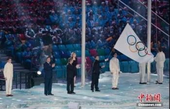 在索契冬奥会闭幕式上,冬奥会会旗被传递到下一个主办地韩国平昌。当日,第22届冬季奥运会闭幕式在俄罗斯索契的菲施特奥林匹克体育场举行。中新社发 刘关关 摄