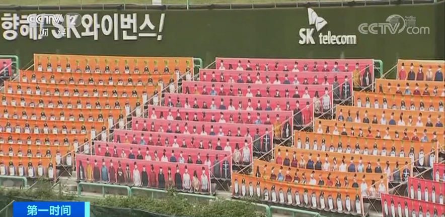 由于不允许观众进场观赛,韩职棒想出了一个办法,那就是在纸板上印上戴着口罩的观众头像,将这些纸板假人放在观众席上充当观众,营造球场氛围。