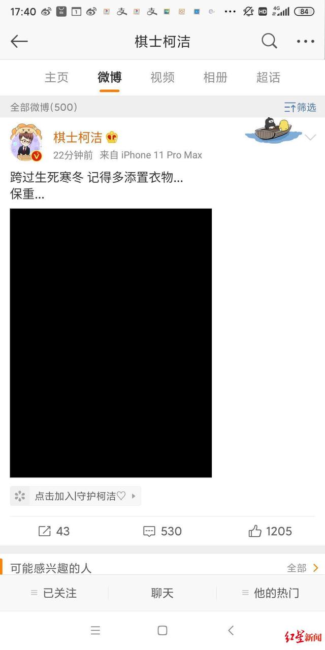 世界冠军柯洁今天下午也在微博上发了一张全黑的图,用张学友《给朋友》里的一段歌词:“跨过生死寒冬,记得多添置衣物。”疑似在沉痛悼念自己的圈内好友。