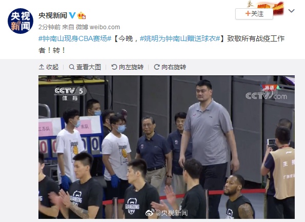今晚,姚明为钟南山赠送球衣,致敬所有战疫工作者!