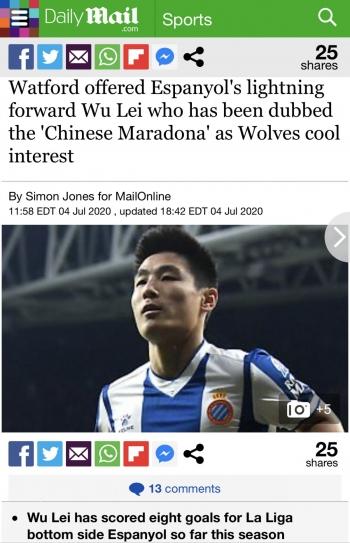 报道中,《每日邮报》对武磊赞赏有加,将其比作“中国马拉多纳”,并表示武磊勤奋的跑动风格很适合沃特福德。“武磊可以踢左右两路,速度很快,本赛季在苦苦挣扎的西班牙人阵中已经有8球进账。”报道写道。