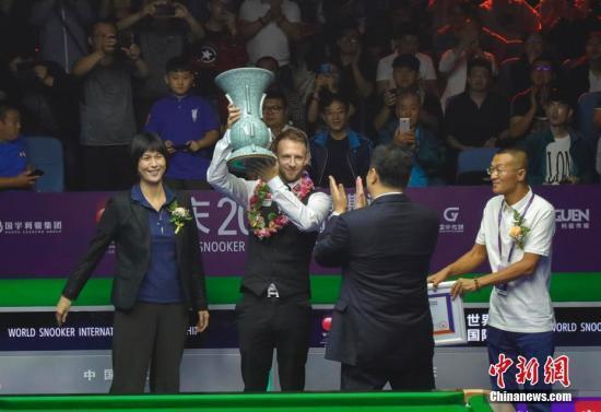 资料图:8月11日,2019世界斯诺克国锦赛在黑龙江大庆结束全部比赛,世界排名第一的贾德·特鲁姆普10比3战胜首次进入国锦赛决赛的肖恩·墨菲,第二次捧起国锦赛冠军奖杯。图为特鲁姆普夺冠捧杯。中新社记者 魏来 摄