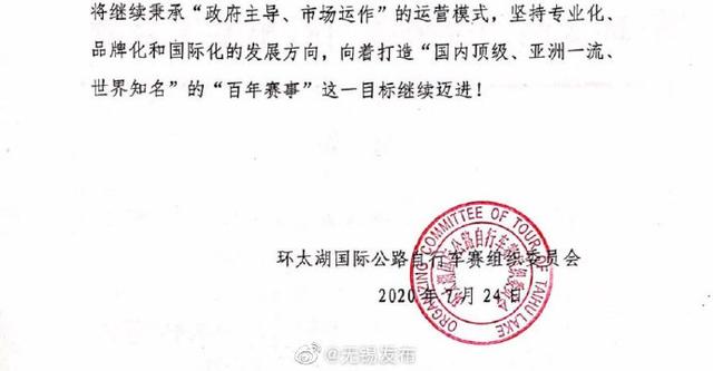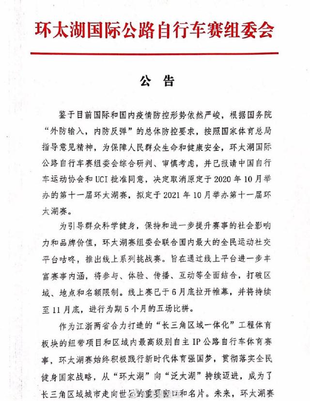 环太湖国际公路自行车赛组委会发布官方消息:环太湖国际公路自行车赛调整至明年10月举办。