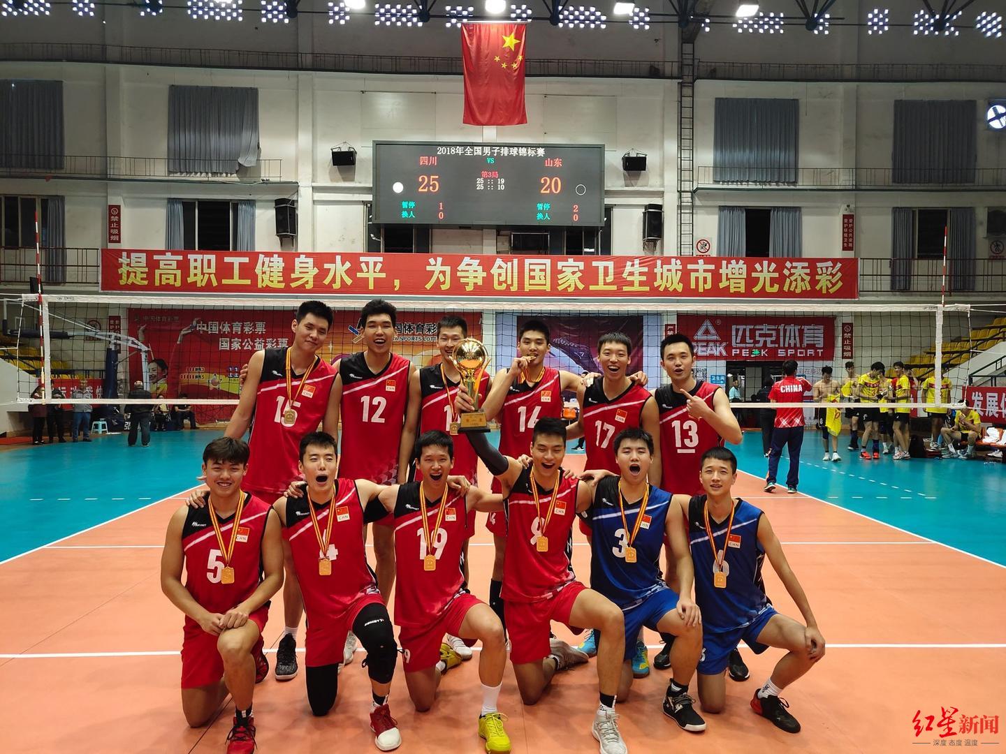 四川男排夺冠后合影,后排右一为杨光