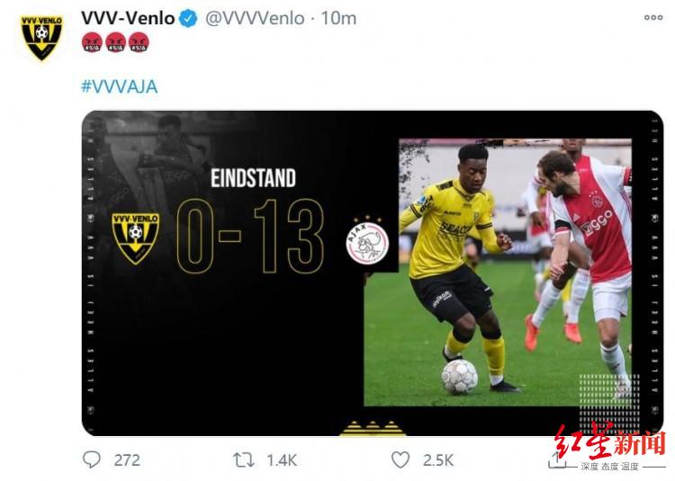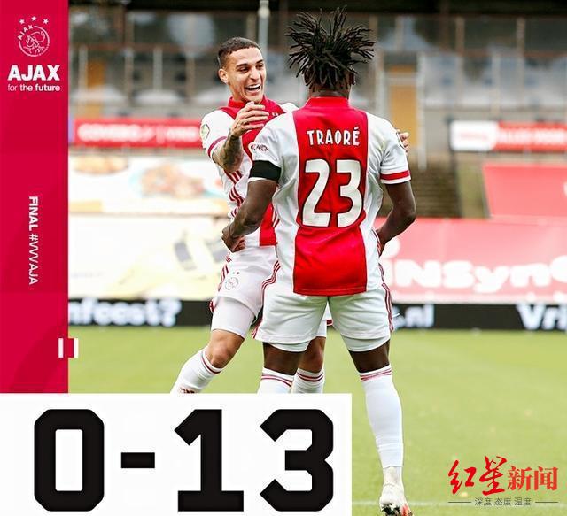 13比0!这样的足球比分给人的感觉更应该出现在青少年赛事中,但现实却是发生在欧洲的顶级联赛——10月26日凌晨结束的荷甲第6轮比赛中,阿贾克斯客场13比0狂胜芬洛,创下五大联赛+荷甲、葡超这七大欧洲主流联赛中的全新分差纪录。