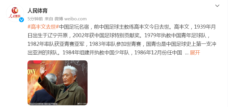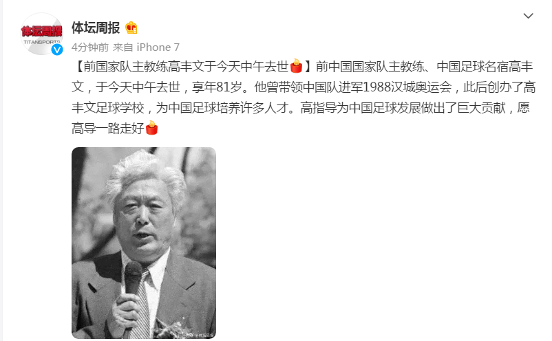 据《体坛周报》、人民体育等多家体育媒体消息,中国足坛名宿、前中国足球主教练高丰文于今天中午去世,享年81岁。