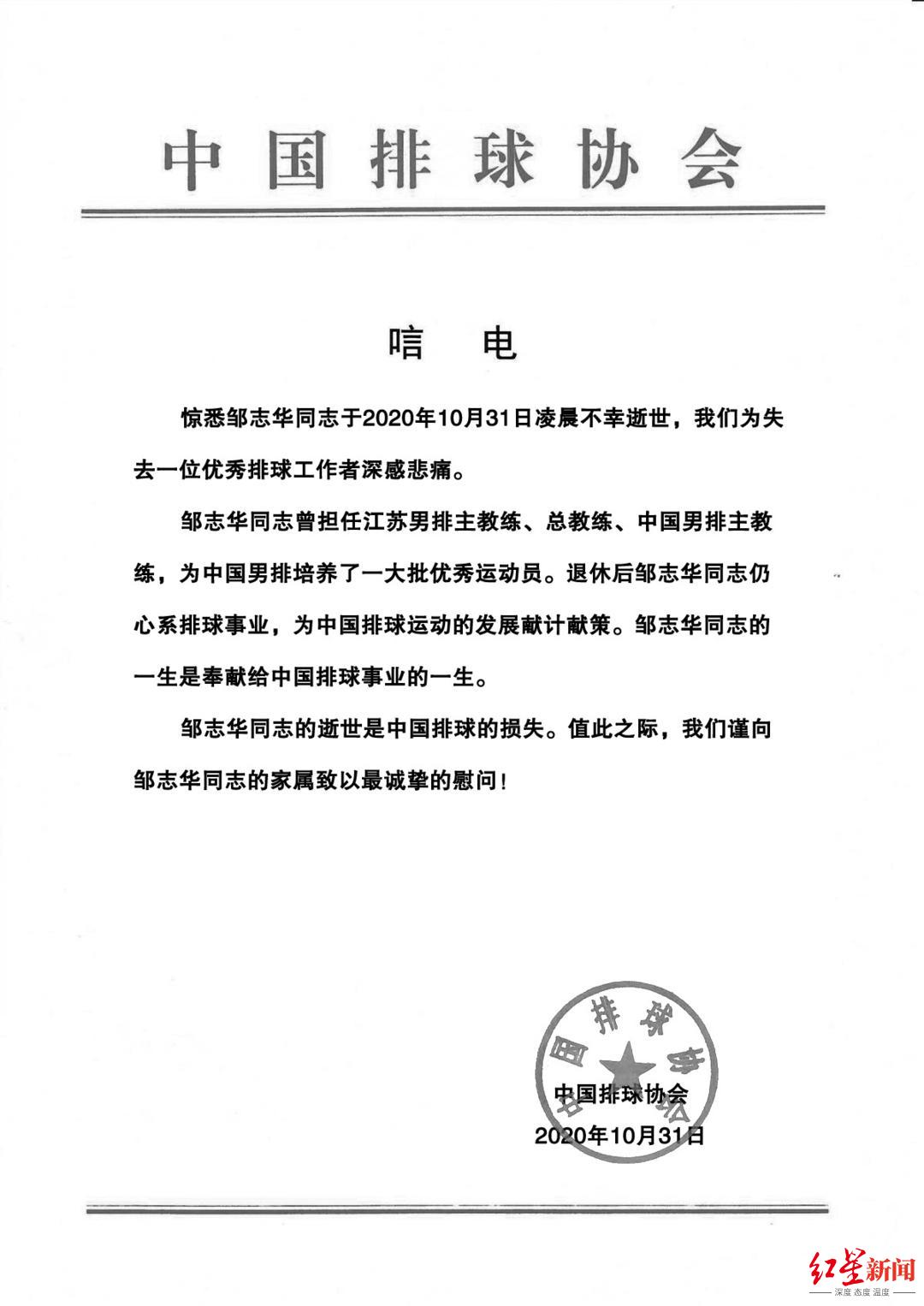 据中国排球协会官网31日消息,中国男排前主教练邹志华于当日凌晨逝世,中国排球协会发布唁电,具体内容如下: