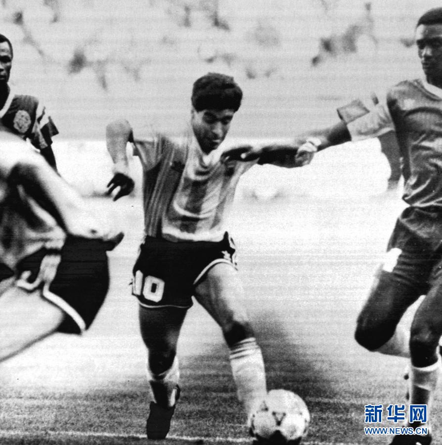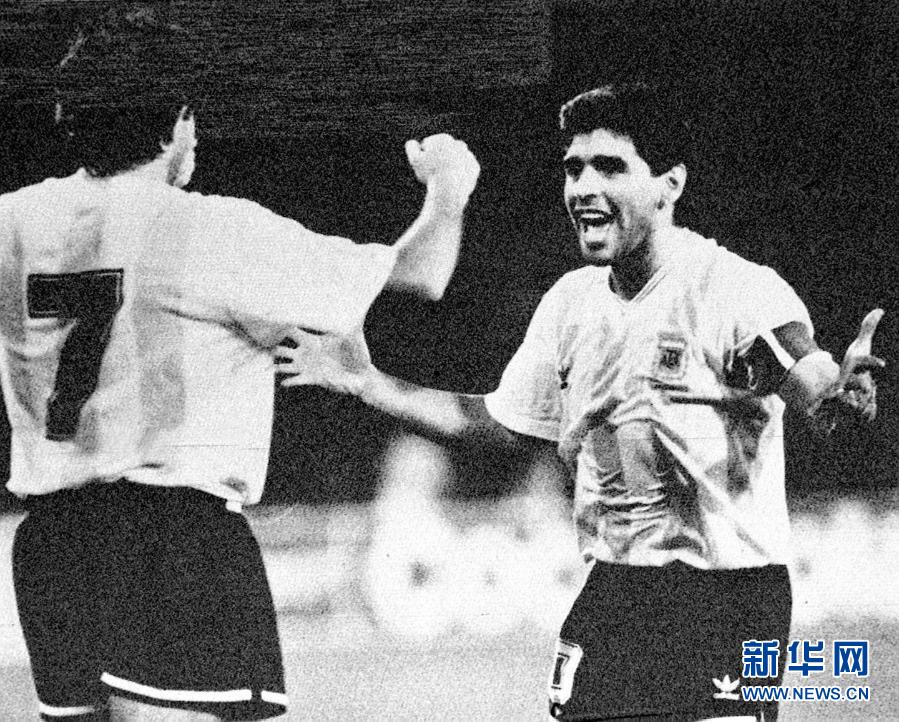 1990年6月13日,在意大利世界杯第一轮阿根廷队与苏联队的比赛中,马拉多纳和队友布鲁查加庆祝胜利。新华社记者徐步摄