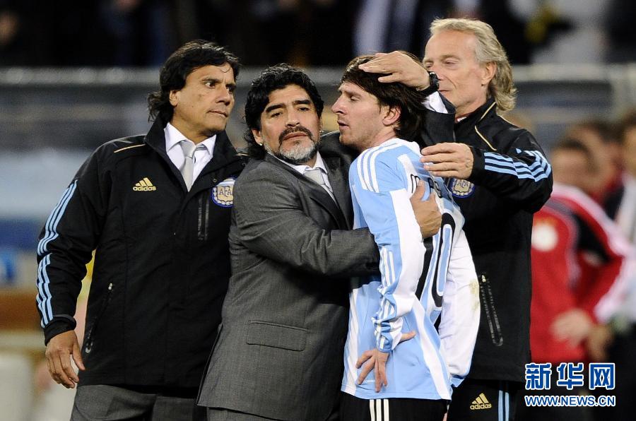 2010年7月3日,在南非世界杯四分之一决赛后,阿根廷队主教练马拉多纳(左二)在比赛后安慰球员梅西(右二)。阿根廷队以0比4负于德国队,无缘四强。新华社发