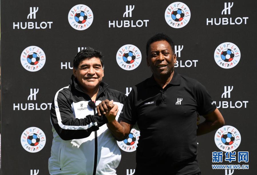 2016年6月9日,马拉多纳(左)和贝利在法国巴黎举行一场商业表演赛前握手致意。新华社记者郭勇摄