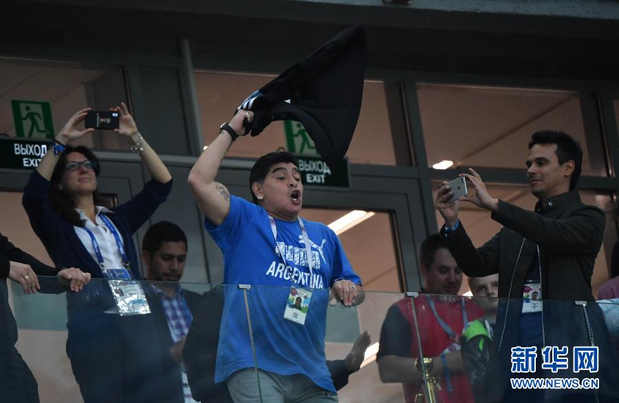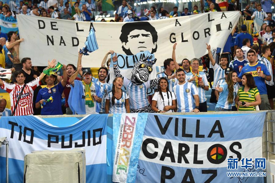 2014年6月15日,在2014年巴西世界杯小组赛阿根廷队对阵波黑队的比赛前,阿根廷球迷赛前打出印有马拉多纳头像的横幅,为球队加油助威。新华社记者王毓国摄