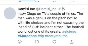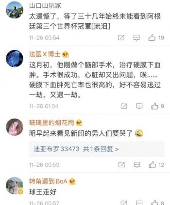 还有人说道,马拉多纳没有亲眼看到阿根廷再次捧起大力神杯,这会是他永远的遗憾。
