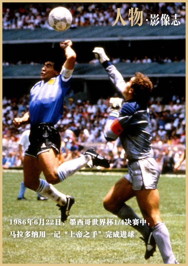 1986年,世界杯1/4决赛中,马拉多纳先是用一记“上帝之手”完成进球。
