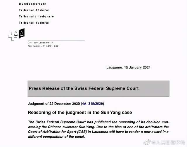 去年12月24日,瑞士联邦最高法院曾发布新闻公报,宣布撤销国际体育仲裁法庭对孙杨的禁赛处罚,但并未公布原因。本次公报则是瑞士联邦最高法院首次公布撤销上述判决的原因。