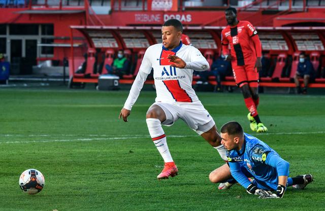 2月27日,巴黎圣日耳曼队球员姆巴佩(左)和第戎队守门员拉乔皮(右下)拼抢。
