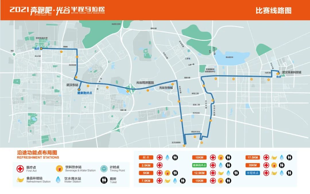 半程马拉松、企业接力赛(21.0975公里):华中科技大学(起点)→珞喻路→佳园路→高新大道→光谷三路(西侧)→光谷三路与流芳园横路折返→光谷三路(东侧)→佛祖岭东街→光谷四路与十里春风折返→生态大走廊→高新大道→光谷七路→九峰三路→顶冠峰路→武汉未来科技城(终点)