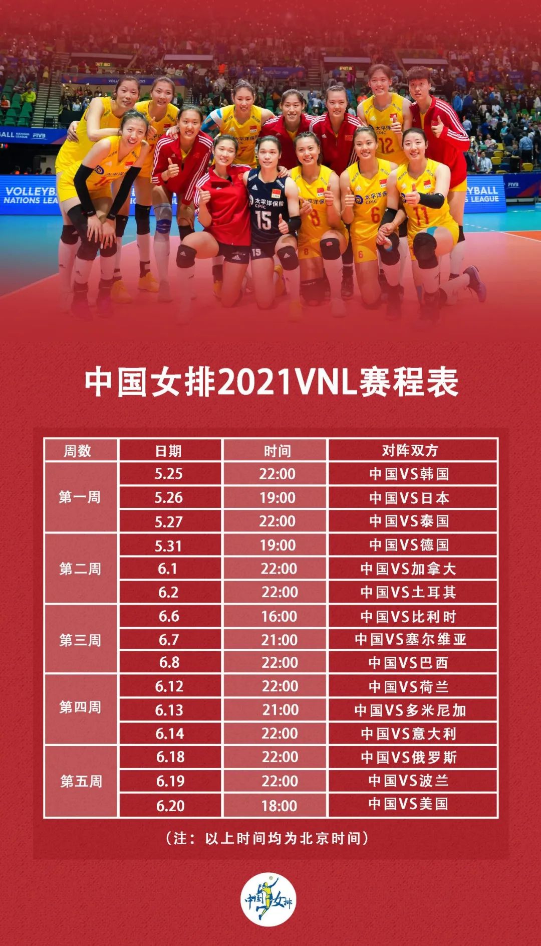 本届世联赛中国女排的首场比赛,将在北京时间5月25日22:00对阵韩国女排,一起为中国女排加油!