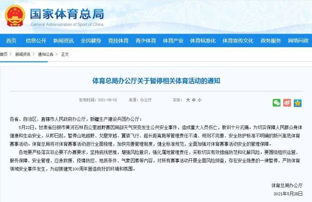 5月22日,甘肃省白银市黄河石林百公里越野赛因局部天气突变发生公共安全事件,造成重大人员伤亡,教训十分沉痛。为切实保障人民群众身体健康和生命安全,从即日起,暂停山地越野、戈壁穿越、翼装飞行、超长距离跑等管理责任不清、规则不完善、安全防护标准不明确的新兴高危体育赛事活动。体育总局将对体育赛事活动进行全面梳理,加快完善管理制度,健全标准规范,全面加强对体育赛事活动安全的管理保障。