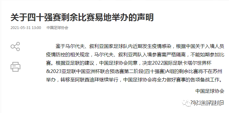 北京时间5月31日消息,亚足联官方宣布,四十强赛A组剩余比赛将不在苏州进行,全部转移至阿联酋迪拜,这对于国足来说是一个坏消息。