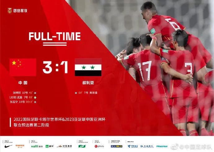 第92分钟,替补登场的张玉宁、尹鸿博打出配合,张玉宁把比分锁定为3比1。最终,国足以3比1取胜叙利亚,时隔25年再次赢球,在“小组第二有效积分榜”中以13分高居榜首,以最好的小组第二身份晋级世预赛亚洲区12强赛。