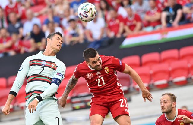 6月15日,葡萄牙队球员克·罗纳尔多(左)与匈牙利队球员博特卡拼抢。新华社/欧新