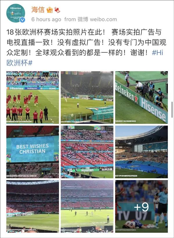 16日下午,本届欧洲杯赞助商海信更是直接发布18张赛场实拍广告照片,证明赛场实拍广告与电视直播一致。