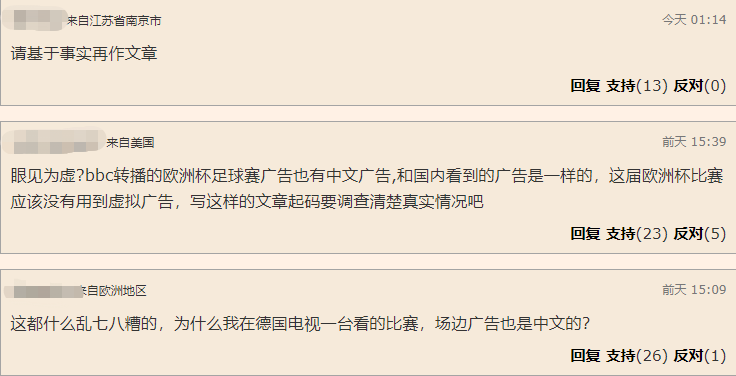 15日,FT中文网默默修改了原文措辞,编辑也于16日在微博道歉称“原有欧洲杯虚拟广告的部分经过查证,绝大部分中文广告为现场广告”。