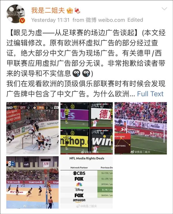 直到16日上午10时14分,@我是二姐夫 才承认“原有欧洲杯虚拟广告的部分经过查证,绝大部分中文广告为现场广告。有关德甲/西甲联赛应用虚拟广告部分无误。非常抱歉给读者带来的误导和不实信息”。
