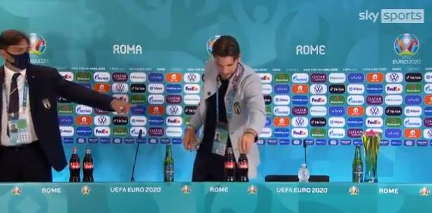 另外,在北京时间周四(17日)凌晨意大利3:0击败瑞士的赛后,为球队攻入两球的功臣洛卡特利也效仿了C罗的举动,他先将一瓶水放入镜头范围内,随后便将原先摆在桌上的两瓶可乐移出了镜头外。
