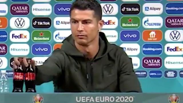 当地时间6月14日,在对阵匈牙利的赛前新闻发布会上,葡萄牙球星C罗将自己面前的可口可乐移开,随后立刻拿了一瓶水,对着镜头说:“水”,言下之意就是自己只喝矿泉水。