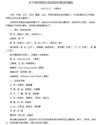 集训名单中,郎平继续坐镇总教练位置,20名运动员包括刘晓彤、曾春蕾、姚迪、李盈莹、王媛媛、丁霞、颜妮、胡铭媛、张常宁、龚翔宇、刁琳宇、倪非凡、林莉、郑益昕、王梦洁、杨涵玉、梅笑寒、朱婷、袁心玥、刘晏含。通知还写道,参加集训的教练员、运动员需于1月30日到体育总局训练局天坛公寓报到。其中,刁琳宇、倪非凡、郑益昕暂不参加集训,集训时间另行通知。