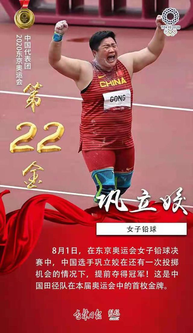 巩立姣用成绩证明自己没说大话,在决赛中投出20.58米,以统治级的表现登上奥运之巅。这不仅是本赛季女子铅球世界最好成绩,也是巩立姣个人最好成绩。而巩立姣的这枚金牌,既是中国田径队在东京奥运会上的第一枚金牌,又是中国女子铅球在奥运会历史上的首金。