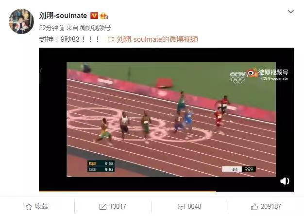雅典奥运会 110 米栏金牌得主、中国田径名将刘翔在微博发文祝贺苏炳添:"封神!9 秒 83!!!"