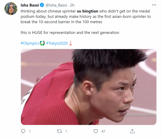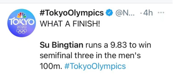 在苏炳添半决赛以9秒83的成绩进入决赛后,美国全国广播公司(NBC)的奥运报道账号在推特上感叹:“多棒的收尾!苏炳添跑出9.83秒的成绩赢得男子100米半决赛。”↓